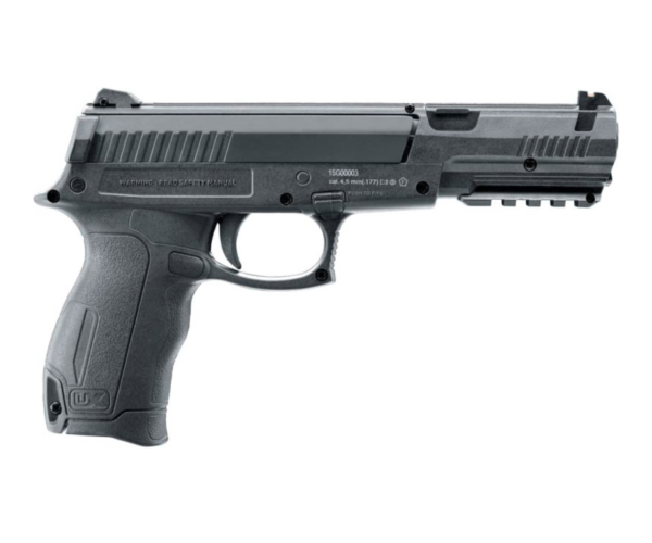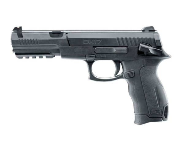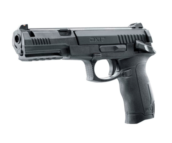 La UX DX17 de Umarex, de carga simple (single stroke), es una pistola de aire ideal para plinking recreativo. Este modelo de resorte–pistón dispara postas, dardos y BBs, e incorpora un depósito interno con capacidad para 15 BBs, lo que aporta mayor comodidad durante el uso.