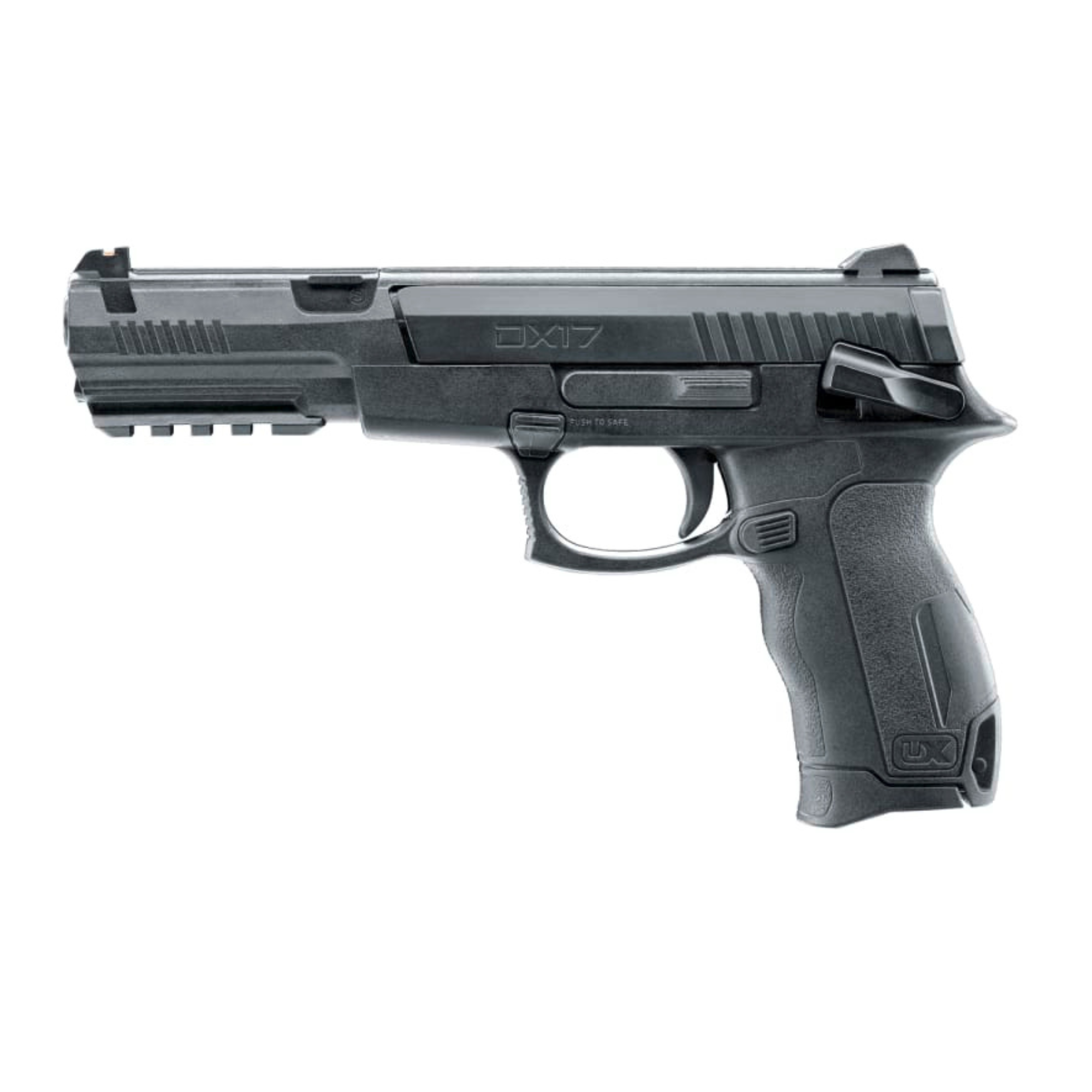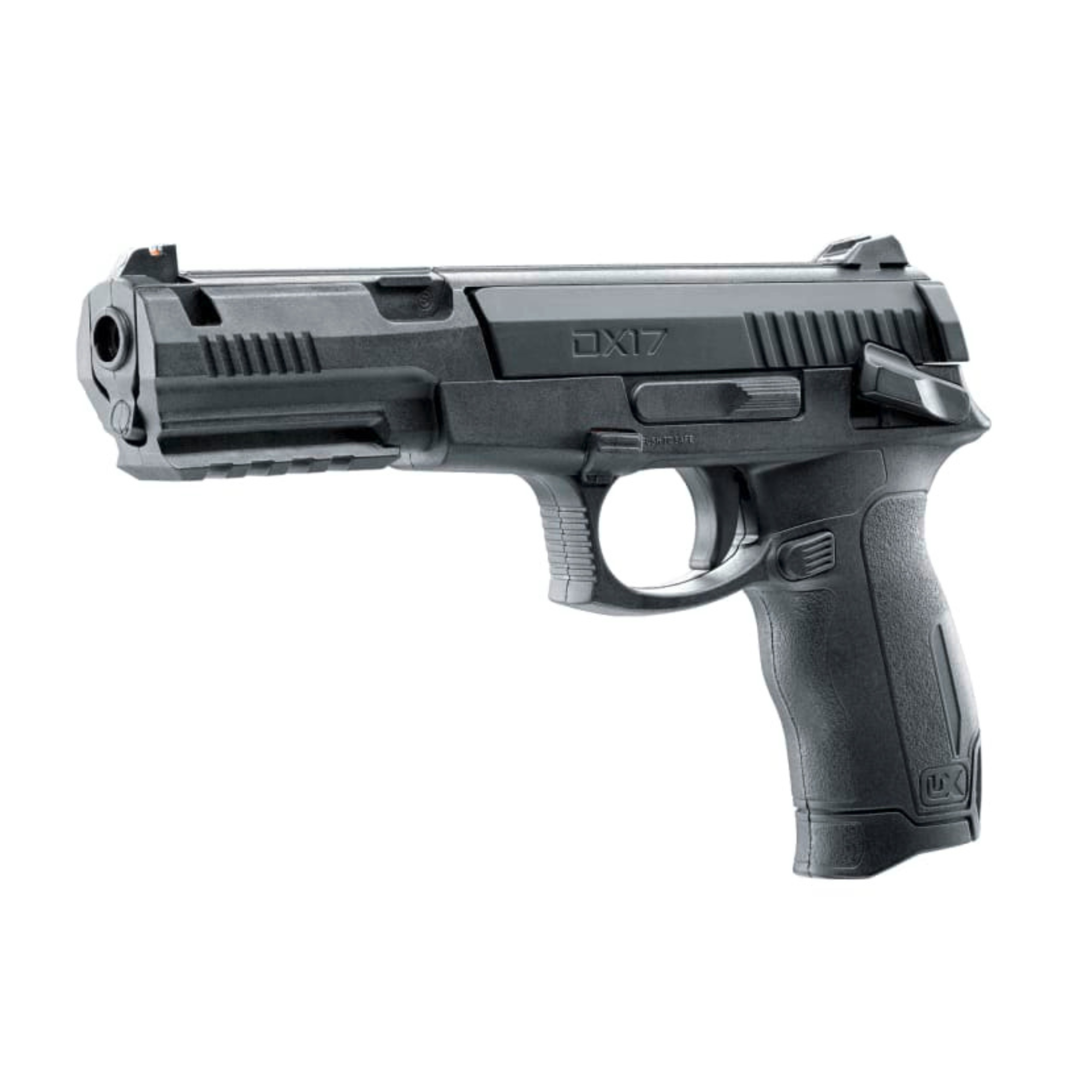 La DX17 cuenta con riel Picatinny integrado, mira frontal de fibra óptica y una empuñadura ergonómica que asegura un agarre cómodo y controlado. Su corredera estriada facilita el amartillado, mientras que el puerto de carga abatible permite una recarga rápida y sencilla de BBs.